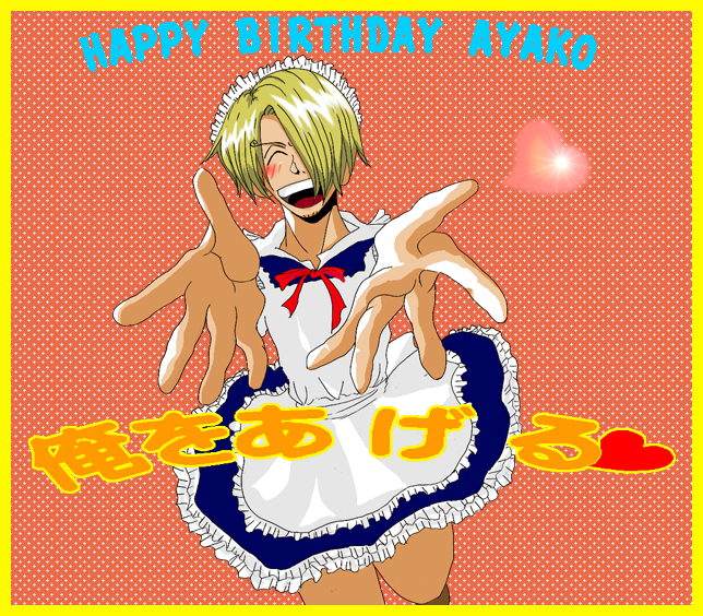 ぶっはあぁ!なんじゃこりゃああぁぁぁ!!!!(鼻血) と、某松○勇作風に、 腹じゃなくて鼻から血を吹き出しながら ころげ回ってしまいましたがなにか?(爽やかに) 20代後半戦突入と言う、ちょっぴりブルーな日も、 これを頂けた事で超ラッキーな一日に変貌ですよ!! 見てください!!この、メイドコスをしながらも男らしい笑顔!! これ! これがいいんです!! 乙女なサンジさんもいいけど、あくまで男らしく且つ阿呆な漢! ああああああああああ!!た、たまらーーーーん!!! あげるとか言われたら即効で喰っちゃうぞう!!! kenyaさん!!本当にありがとうございましたーーーー!! |