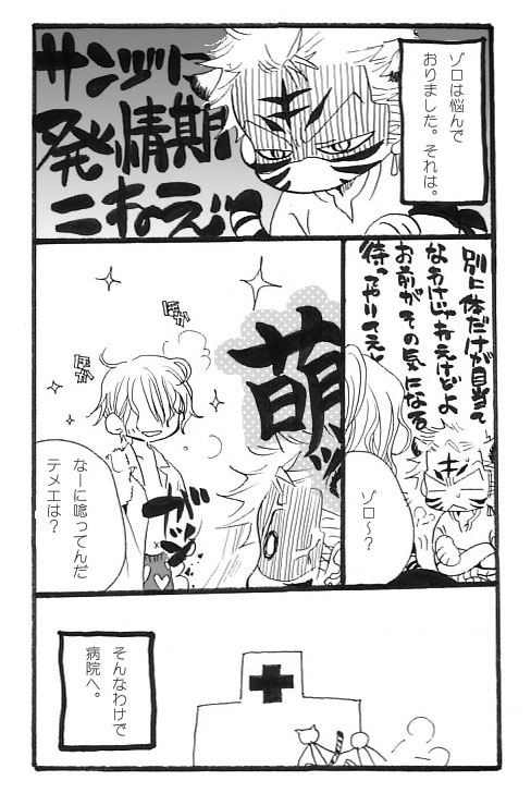 うわああああああああん!!聖様から虎ゾロくんを頂いてしまいましたーー!! やったーー!やったーー!!!(狂喜乱舞で踊りまくり) もうね、私、このお話は1話の頃から大好きだったのでス! あー!ぽち○まネタだ〜って最初思って一言メールを送ったのが最初だったかなぁ。 (懐かしい、うっとりv) それ以来ずっと私を魅了しまくってくれた虎ゾロ君v そ、そんなあなたが家のHPへええええええ!!! うぎょーーーーー!!うれしーー!うれしいいいいいいいい!! 次へ