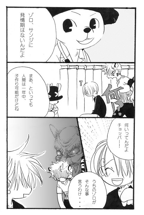うわはははははははは!! うわあああああい!!ゾロの背後にスタンド(@ジョジョ)がいるよ!! 「家のゾロはまだ子供だから そんなエッチなことは考えもつかないのさv」 とかって、信じ込んでいるサンジさんがたまらなくいとおしいです!! そうやって、信じたまま虎ゾロ君に孕まされてしまうといいんです! やたー!御懐妊おめでとう!!!(気が早いです彩子さん) ところで、椅子に座っているサンジさんの 頭の丸さが、あまりにも可愛らしいんですが 私はどうしたらいいですか?(ハァハァもんもん) 聖さまぁー!本当に本当にありがとうございました!! 大好きですーーーーーーーーーーーーーー!! |
