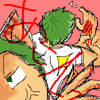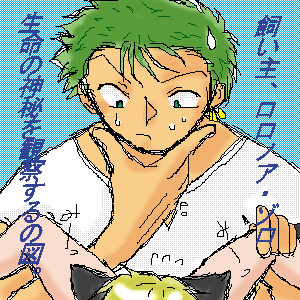 「・・・どっから産んだんだ?」 こういうことは、驚きはしても、 不思議に思ってはいけないのがパラレルの常識ですのに(爆) 妙に生真面目な性格をしているロロノアさんは、 サンちゃんが赤ちゃんを産んだ事が不思議で不思議でたまりません。 サンちゃんが、ロロノアさんのすることなら何をしても怒らない事をいいことに、 思わずじっくり観察してしまいました。 |