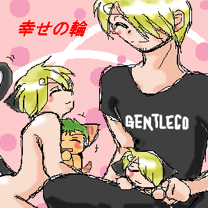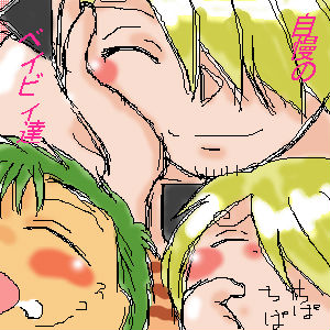 『今日は、ゾロとサンジのステキなお友達、 ナミさんが家に来たんだ。 俺とロロの赤ちゃんを見に来たって言うから、 俺ははり切って歓迎したぜ? ナミさんが 「サンちゃん、この子達にさわっていい?」 って聞くから、 どうぞどうぞって笑って答えたんだ。 なぁ、ナミさん。 俺たちの赤ちゃんかわいいだろ? ロロ似の赤ちゃんは、今から男前だし。 俺似の赤ちゃんは将来器量良しになる事間違いなしだ。 そうしたらナミさんも、綺麗な笑顔で 「そうね、とっても可愛いわね。」って言ってくれた。 ナミさんにいっぱい遊んでもらって、 疲れて寝ちまった赤ちゃんたちの寝顔を見ながら、 俺はすっごく幸せな気持ちになれたんだ。 なぁ、ロロ。お前もそうだろ?』 |