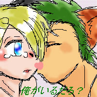「サン。お疲れ様。」 にゃ〜v ゾロVsロロの戦闘の裏で、 こんな幸せな図が展開されていた模様(w |