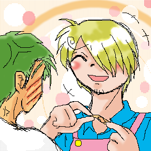 お昼を少し過ぎた頃でしょうか。 ピンポーンと、ドアチャイムが家の中に響きます。 それにすかさず反応したのは飼い主のサンジで、 「ぬぁみすわあああああああんん!!!!! ごめんねえええええ!!なんだか、急がせちゃってええええええええ!!!!」 などといいながら、玄関に突進してゆきます。 どうやらナミがまた家にきたようでした。 けれど、ネコ二匹。 いつもだったらナミが来た途端サンジと一緒に突進するはずのサンちゃんも、 くったりとクッションの上で寝転がったままです。 玄関では 「ごめんねサンジ君。 いい具合のポーズを取れるまで時間がかかっちゃったらしくって・・・」 「いいのさぁ〜〜〜vvナミさんにはこれーっぽっちも責任はないさv 全ては、仕事のおせぇ長っパナのせいなんだよ〜〜。気にしないでねvv」 「うん、でも、サンちゃんたちは大丈夫?」 などと、会話が進んでいますが。 サンちゃんなどは、さんざん泣いたせいであまりよく通らない鼻をぐすりと鳴らしただけで無反応です。 しかし、その時でした。 ゾロが、サンちゃんを無理やり抱き上げ、ロロの首根っこを捕まえて歩き出しました。 二匹とも、これにはさすがにビックリして、ふぎゃぁ!と声をあげます。 ロロは爪を出して威嚇までしましたが、ゾロはそ知らぬ顔で玄関まですたすたと歩いてゆきます。 そして、玄関まで連れて来られた二匹ですが。 サンちゃんとロロを見たナミさんは、すまなさそうな顔で二匹に言いました。 「ごめんなさいね、サンちゃんにロロ。 ずいぶん長い間、赤ちゃんを借りちゃって。」 二匹とも、目と耳を疑いました。 だって、そこには・・・ ナミさんの胸には、もう自分達の元には戻ってこないはずの、 可愛い赤ちゃんが居たのですから。 |
