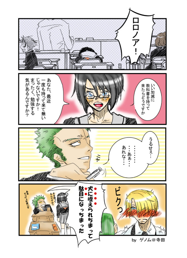 じゅぷじゅぷとイヤらしい水音が、この狭い空間に響いている。ゾロという名の、少年と言うには逞しい体つきの生徒が腰を揺するたび、 サンジは、喉の奥を突かれ吐き気を催したが、それでも懸命に目の前のペニスにしゃぶりついた。 教師であるサンジが教え子のゾロに初めて犯された日から数日間は、なるべく理科準備室で犯される事が多か った。 だが、しばらくすれば、ゾロはだんだんと人のいない場所を上手く探し出し、そこでサンジを犯すようになっ た。 そもそも学校内で犯されるという事自体が異常な事ではあったが、 それでも鍵はかかるし、基本的に人が寄り付かない場所にある理科準備室ならばと、 サンジが慣れてきてしまったのが原因なのかもしれない。 ゾロは次第に行為をエスカレートさせ、 サンジが恥ずかしがれば恥ずかしがるほど、絶望に叩き落されれば叩き落されるほど、 その口元を歓喜の笑みに歪める。 今サンジが犯されている場所は、3年の校舎のトイレだった。 そもそもこの学校では3年になれば部活動をする事もなくなるし、 進学校ゆえに大体の者は塾などへ行くため、放課後になればすっかりと人気がなくなる。 確かに人が来ない絶好のポイントではあったが、それでも何があるかわからない。 そんな場所で、サンジは全裸にさせられ、ゾロに対する奉仕を命じられた。 どうもトイレの窓が開いているらしく、野球部らしき生徒達の掛け声がサンジの心に切なく響く。 神聖な学び舎で、自分は生徒とこんな淫らなまねをし、尚且つ身体は悦んでいるのだ。 サンジの乳首はぽってりと赤く腫れあがり、もう、人前でシャツなど脱げなくなってしまった。 すこしゾロに触れられるだけでペニスから先走りを出すほどに敏感になってしまい、 そのペニスもゾロによって施された赤い飾り糸によっていつも戒められている。 もちろん、ゾロのいないところではずす事も可能だが、 その後に起こるお仕置きが怖くて、サンジはただ従うしかない。 そして、男など知らなかったはずのアナルは、 いまやいつもゾロのペニスを待ち望んでいるかのように、しっとりと濡れそぼっているのだ。 既にペニスだけでの快楽だけでは達する事が出来なくなっており、 アナルに何かを入れられる事でやっと射精が出来るという現状。 教師になろうと志した気持ちが純粋な気持ちだったゆえに、今の自分があまりにも情けなく、 声を出してしまえるのなら、大声で泣き叫びたかった。 「サンジセンセイ。俺のチンポそんなに美味ぇかよ。 自分のチンポ触ってもいねぇのにもうこんなビンビン・・・」 興奮しているのか、少し擦れた声が降ってくる。 いっそ優しいくらいの手つきで頬を撫でられ、 サンジは観念したかのように目を閉じながらちゅぱっと小さな音を立ててペニスから唇を離す。 「・・・お、おいしい・・・です。」 誰も近くにいないことはわかっていても、それでも自分の声を発する事は恐ろしかった、 だがゾロが望むようにはっきりと言わなければならない。 「そうか、じゃぁ、センセイのもっと大好きなザーメン飲ませてやっから、 しっかり顔で受け止めて全部飲め。」 「は、・・・い。ロロノア君の、熱くて・・・美味しいミルクを・・・さ、サンジ先生に・・・ください。」 ゾロは、しっかりと普段教えたとおりの台詞を言うサンジを満足そうに見つめ、 その髪をつかんで顔を固定すると、自分でペニスをガシガシと勢い良く擦る。 まさにサンジの目の前で、ペニスの先端がぐぅっと張り、 ゾロが息を詰めたのと同時に、まるで爆発するかのように鈴口から精液が飛び散った。 サンジはそれを舌を突き出しながら口に受け止め、予定外に飛んだ雫が、髪や頬を汚す。 若いせいなのか、大量の独特のえぐみのあるそれを、ごくごくと何度かに分けて飲み下し、 汚れた顔をそのままに、再びゾロのペニスに吸いついて、尿道の中に残った精液も全て飲み終えた。 「ぅふ・・・」 小さく息を吐くと、そのまま少し萎えたゾロの竿や玉袋に、 ちゅ、ちゅとついつばむように何度もキスをし続けた。 さわさわとこういうときだけ優しい雰囲気になってくれるゾロの手が、髪や耳に触れ撫で回す。 「なぁ、サンジセンセイのチンポはどうなってる?」 問われて、勝手にそそり勃ち、縛られている事によってパンパンに張っている睾丸が、ゾロに良く見えるよう 、更に足を広げた。 ギラギラと強烈な雄の視線を股間に受けて、 サンジの体は勝手に熱を持ち、先走りがポロリと竿を伝う。 「あぁ、いい塩梅だな。 次は、後ろ向いて、センセイの可愛い尻の穴を見せてみな。 俺のチンポが欲しくって、いっつもびちゃびちゃに濡れちまうソコを奥まで見せるんだ。」 言われるままに、便座に蓋をしてその上に膝をつき、 指で尻の肉を割って、真っ赤に熟れたアナルを開いて奥まで晒す。 そして、いつもの様に恥ずかしい格好をさせられるたび、携帯にその姿を納められる。 パシャリと言う電